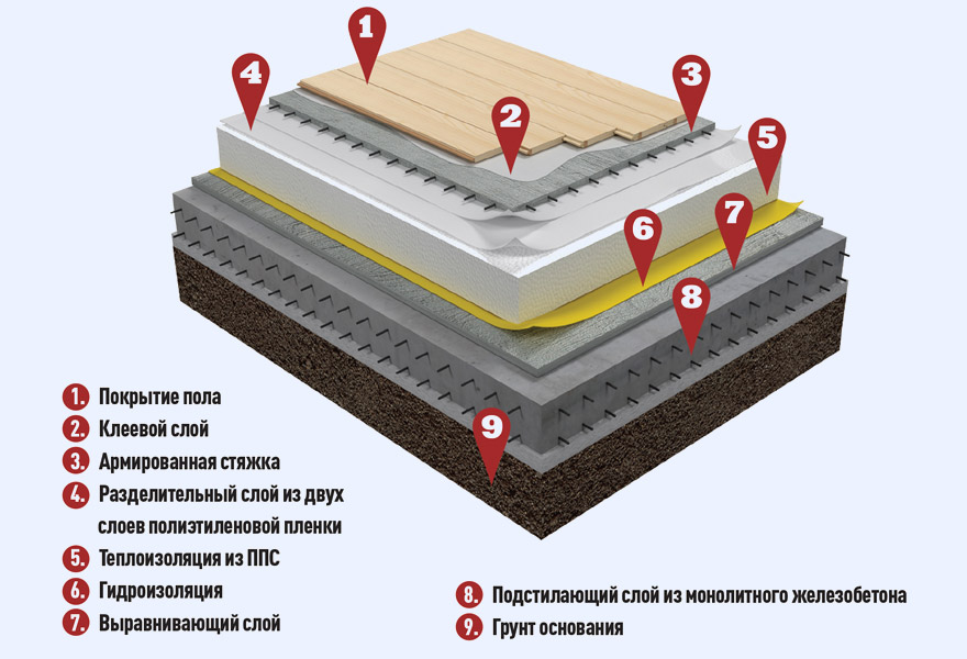 Разработан шаблон спецификации в соответствии с ГОСТ Р 21.1101-2013. Пол по грунту с теплоизоляцией из пенополистирольных плит ППС25-Т, уложенной по подстилающему слою из бетона. На теплоизоляцию укладываются разделительный слой из двух слоев полиэтиленовой пленки, армированная стяжка, клеевой слой и покрытие пола. Применяется в многоэтажном строительстве.